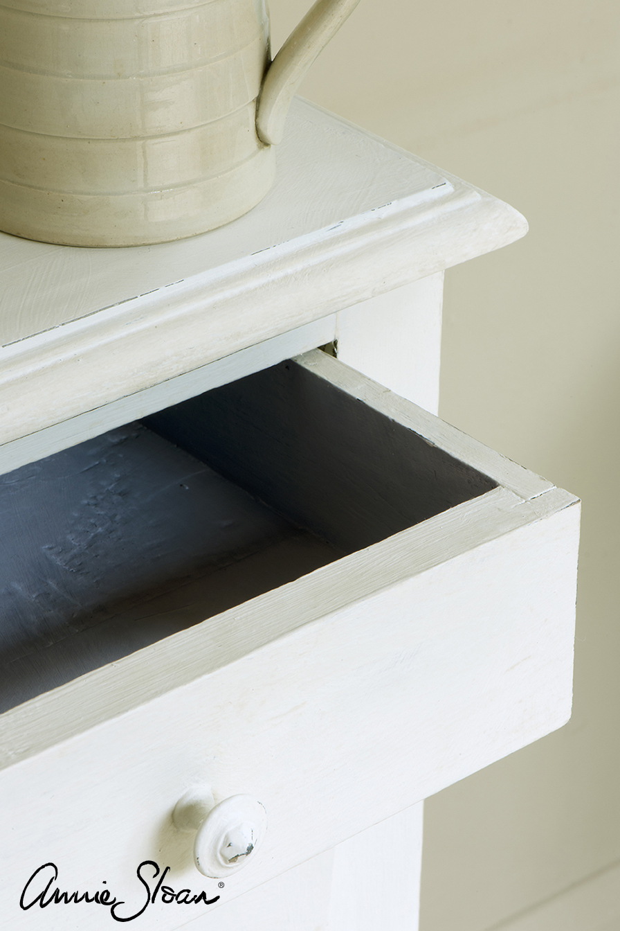 Farbę zabezpiecza się woskiem bezbarwnym Clear Annie Sloan (dostępnym na stronie) lub lakierem bezbarwnym do drewna – wodnym lub poliuretanowym (dostępnym na stronie).
