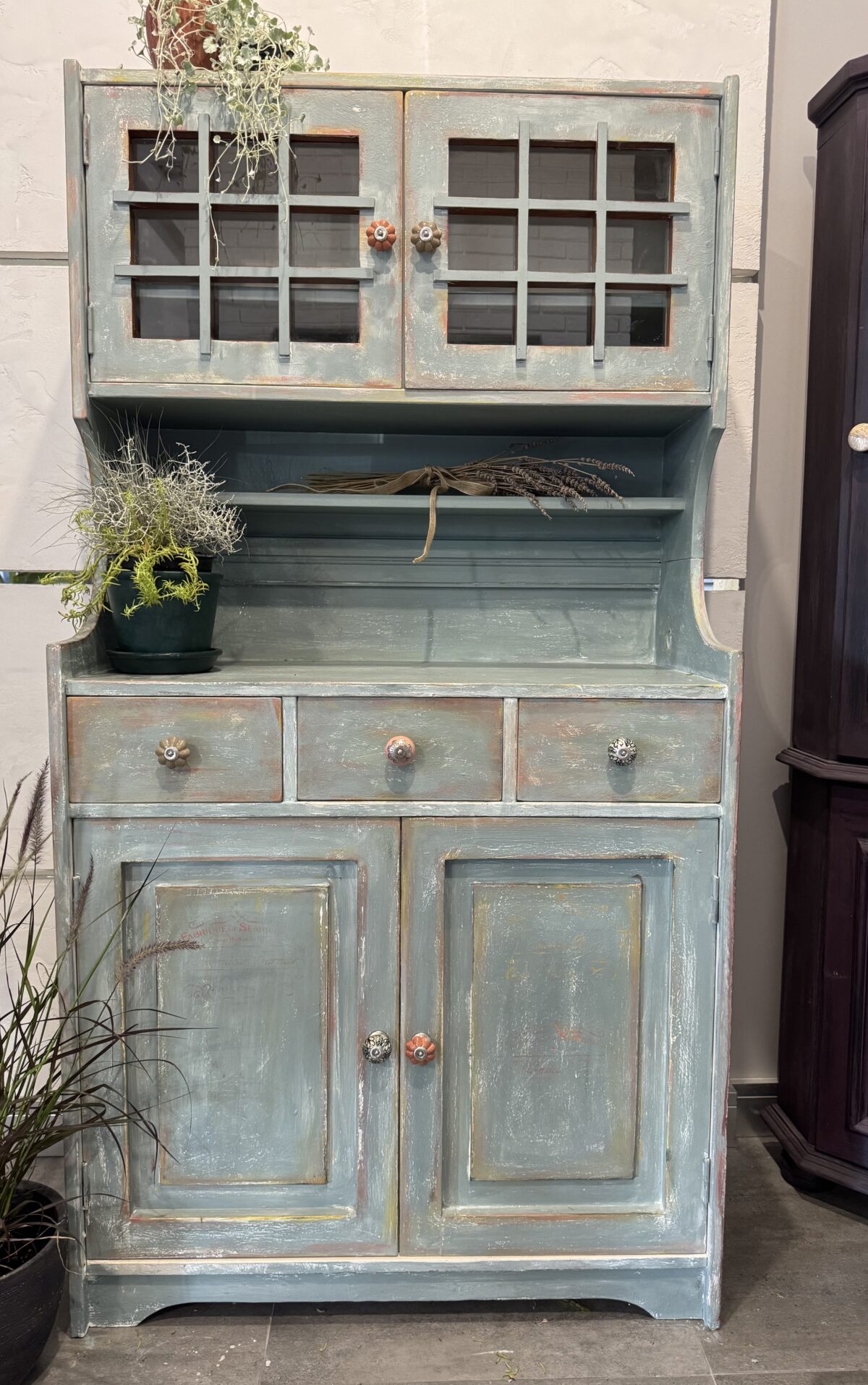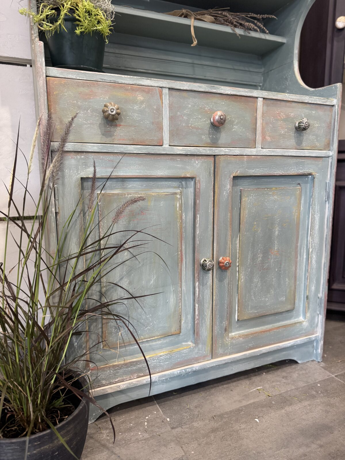 Wyjątkowy kredens wystylizowany farbami Annie Sloan w kolorze Duck Egg Blue – delikatnym, eleganckim błękicie z subtelną nutą zieleni, inspirowanym klasycznymi francuskimi i skandynawskimi wnętrzami.