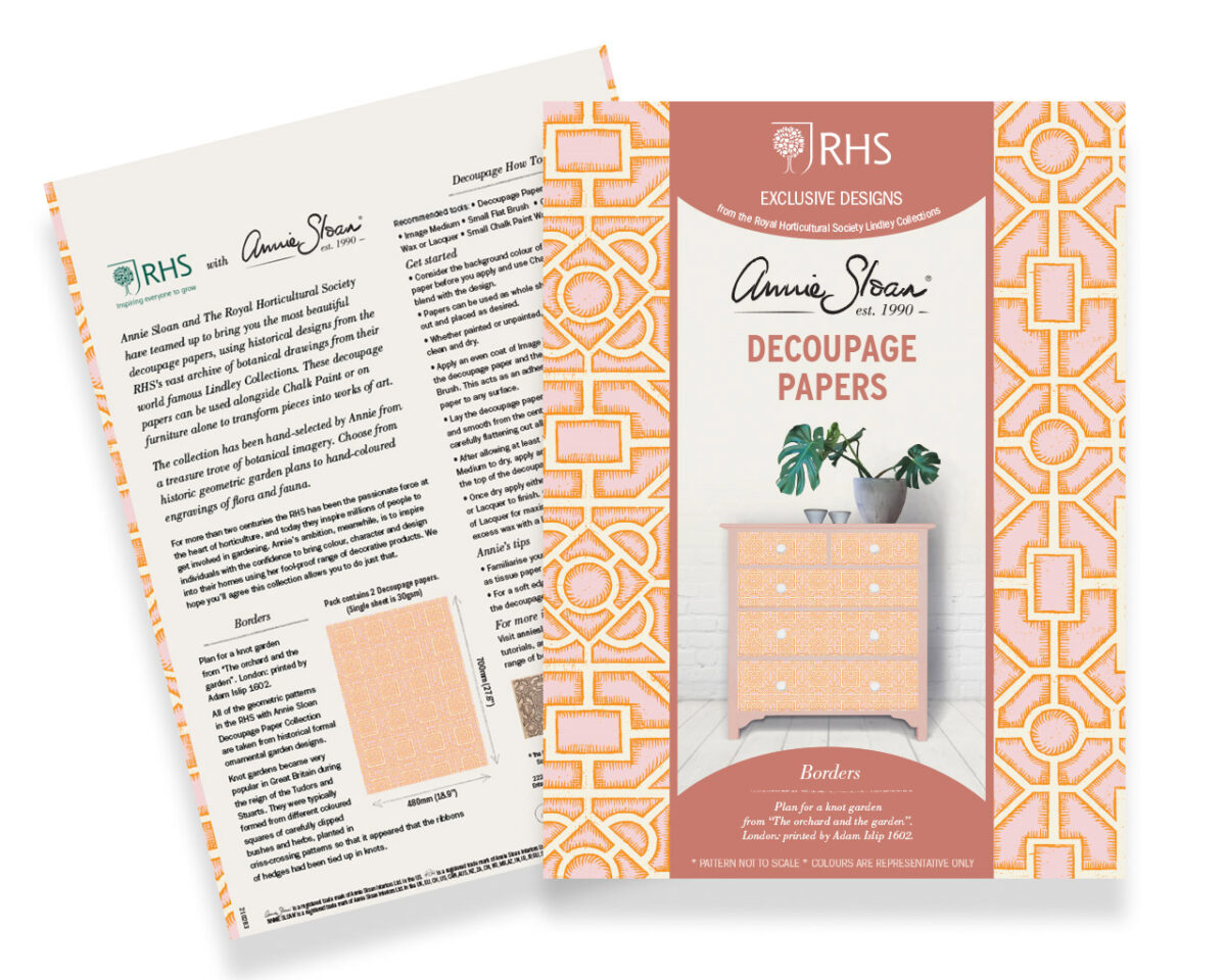 Annie Sloan stworzyła kolekcję papierów do decoupagu, wykorzystując oryginalne projekty ogrodów i rysunki botaniczne sięgające aż XVII wieku.