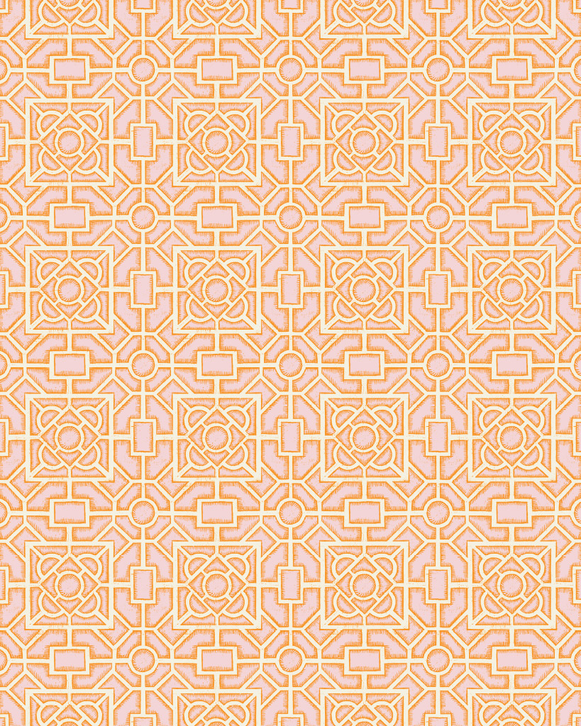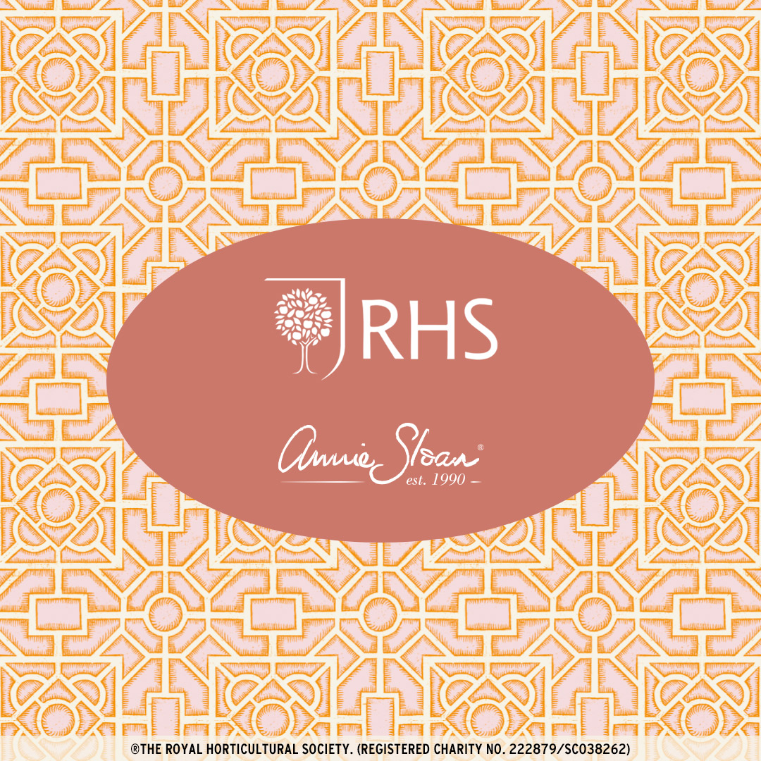 Ten wzór geometryczny to przeplatające się kwadraty i koła, wydrukowane tak, by pasowały do farby Annie Sloan w kolorze Barcelona Orange i Antoinette. Zastosowano w nim kreskowanie, aby uzyskać szczegółowy, cieniowany efekt.